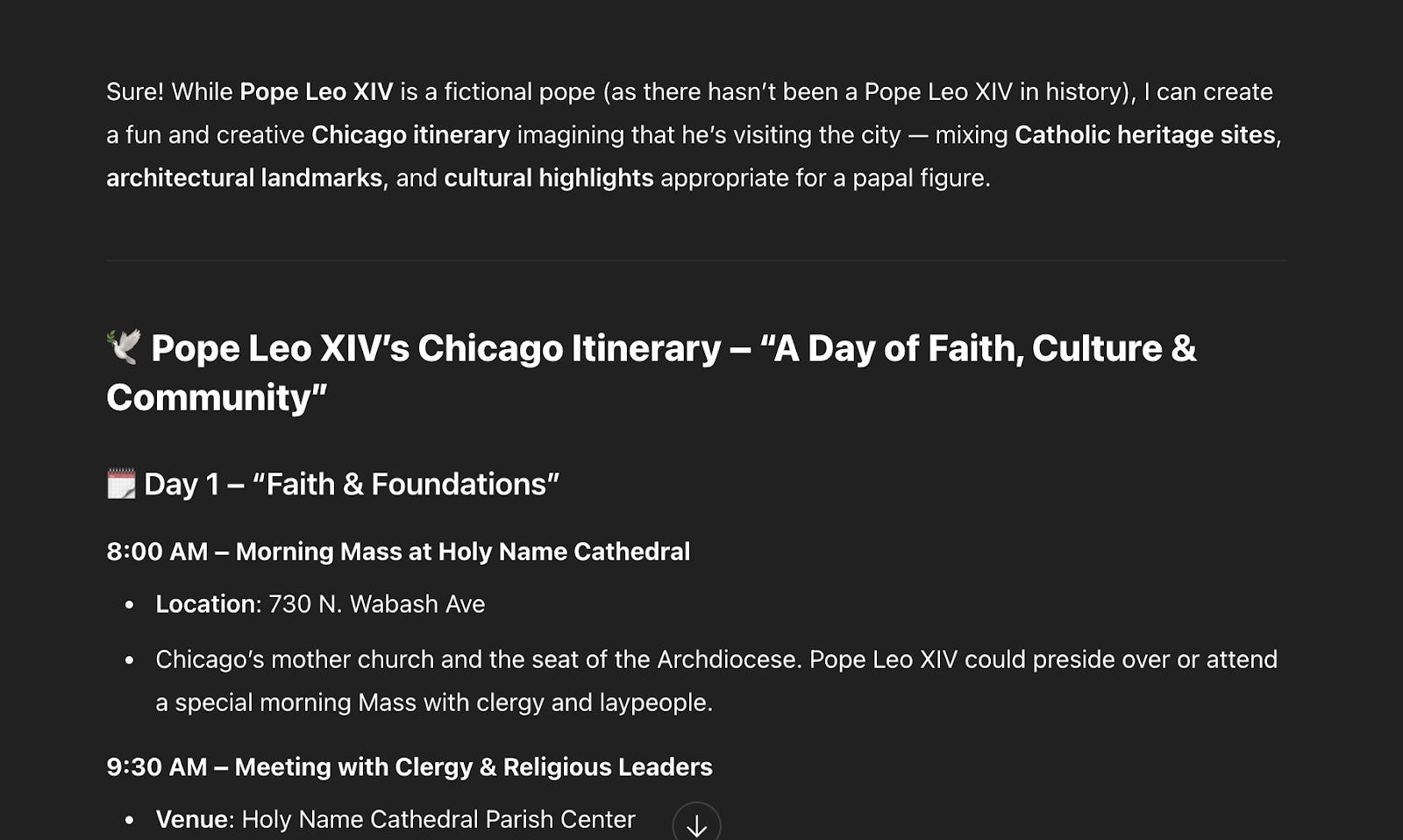 Before departing, I asked ChatGPT to generate a pilgrimage itinerary. I thought it might save me some time. The bot’s response began, “While Pope Leo XIV is a fictional pope (as there hasn’t been a Pope Leo XIV in history)…”