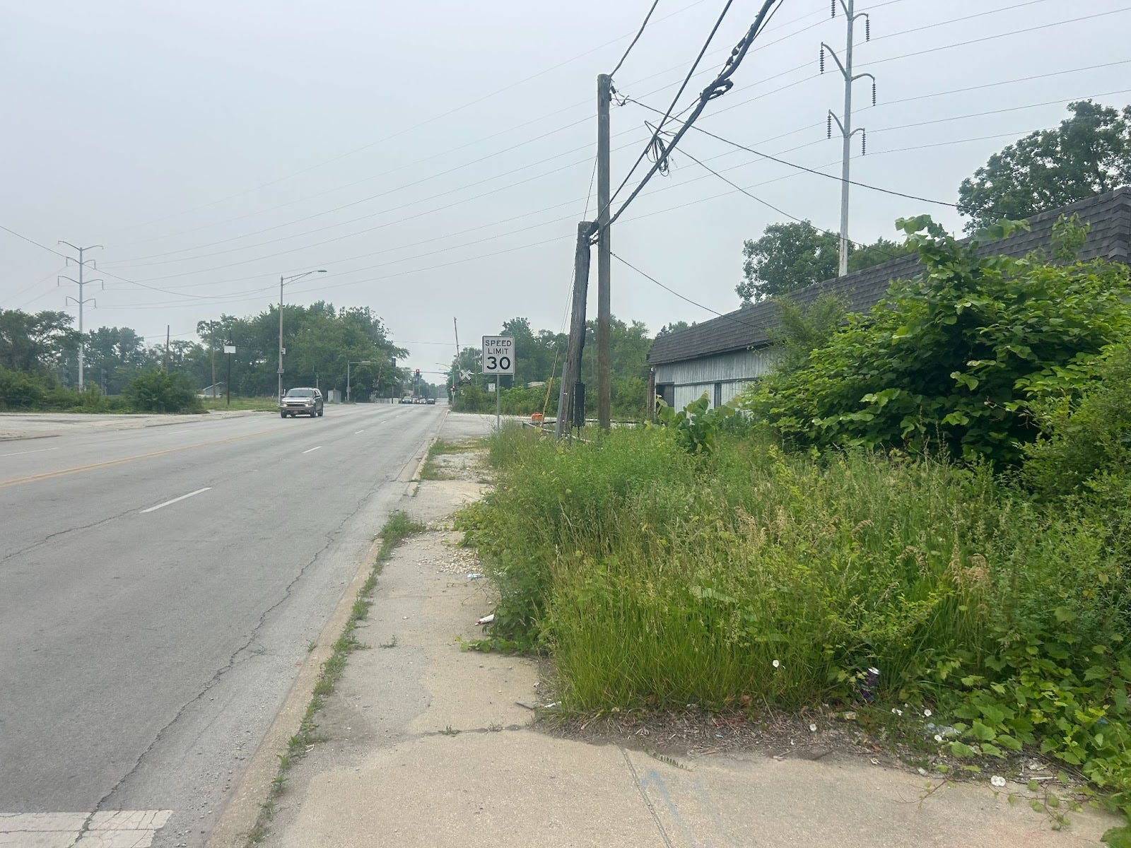 The path leads along Indiana Street, past apartment complexes and industrial warehouses. Trash litters the sidewalk and overgrown weeds cover the sidewalk. After crossing the second set of train tracks, you turn right onto Leyden Ave, where a sign for Dolton, Illinois will greet you.