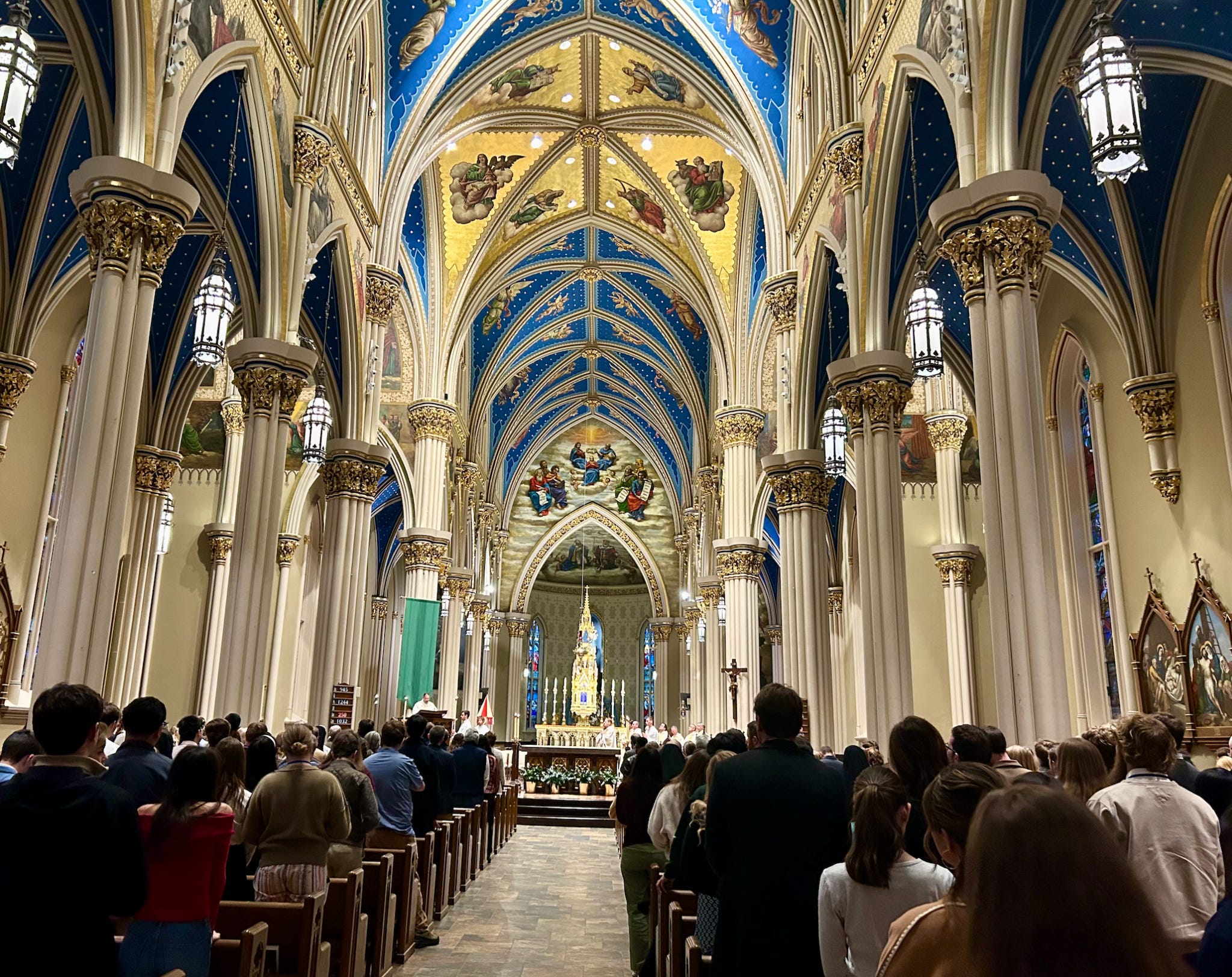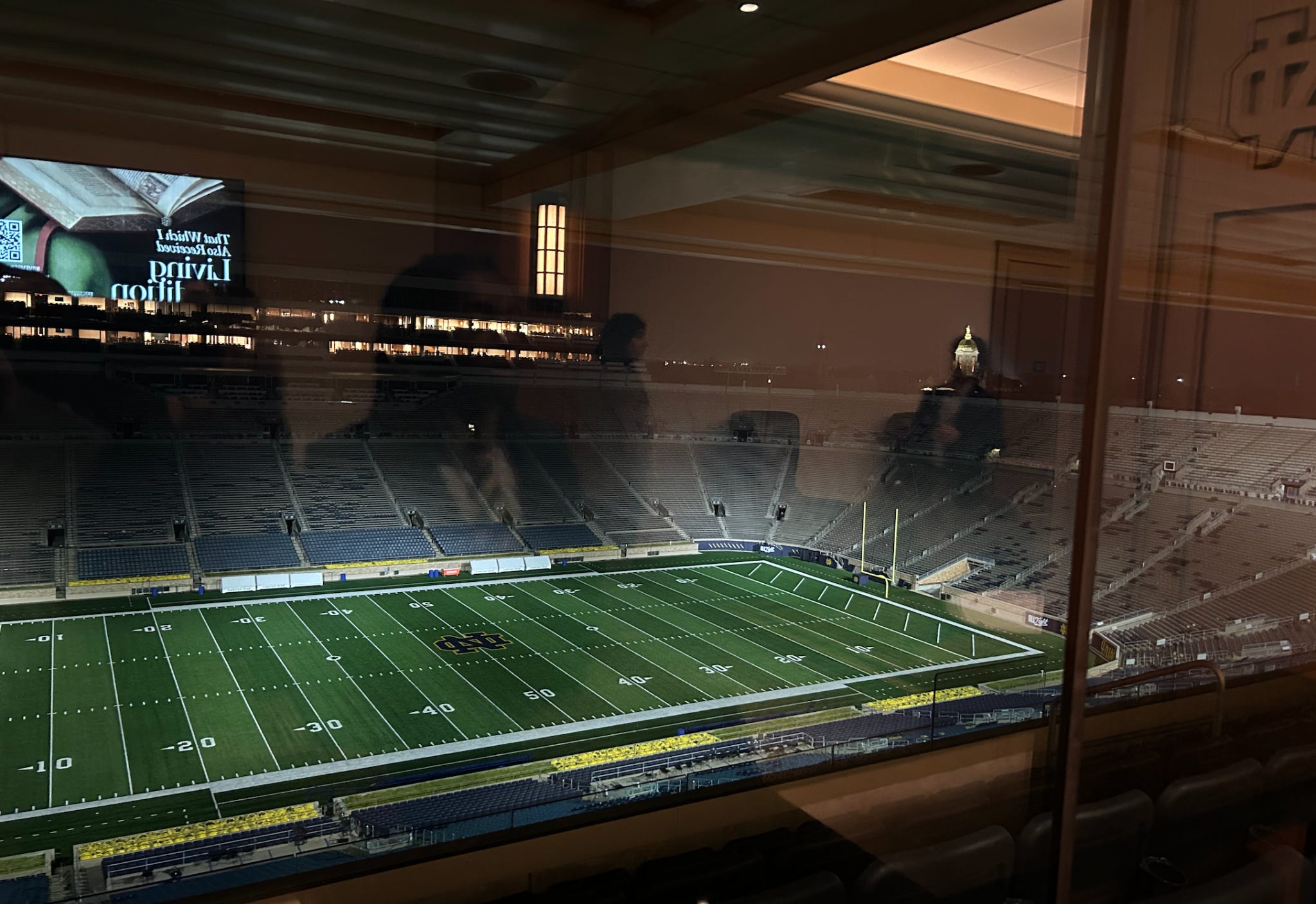 Which place, I wanted to know, was the primary part of Notre Dame — the beautiful basilica, which I saw absolutely packed with students, or the reverence paid to the “other cathedral” across campus, Notre Dame Stadium?
