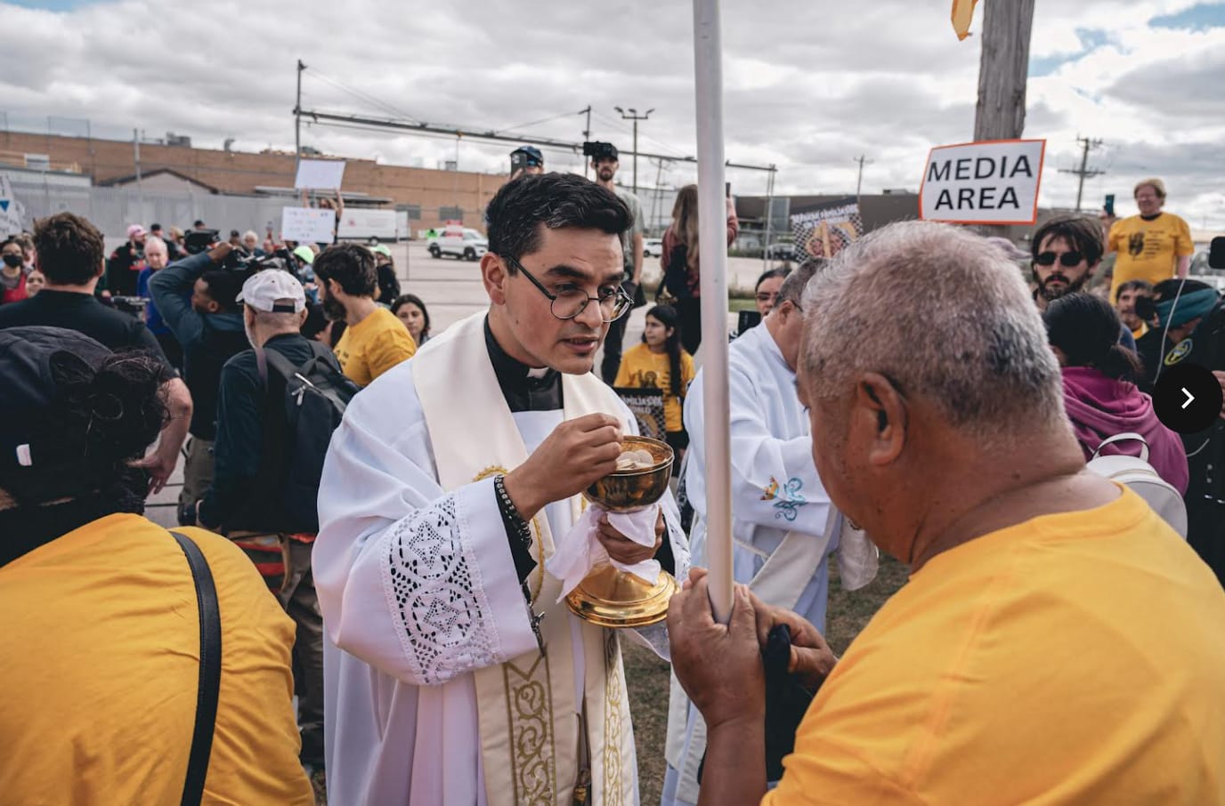 Asked about criticism that the Eucharist could be “politicized” in a procession toward an ICE facility, the priest said the procession’s aim “is not to make the Eucharist a weapon … it’s basically exercising a right as Christians to bring the Christian message and the love of God to these people who are in really inhumane conditions inside the jail.”