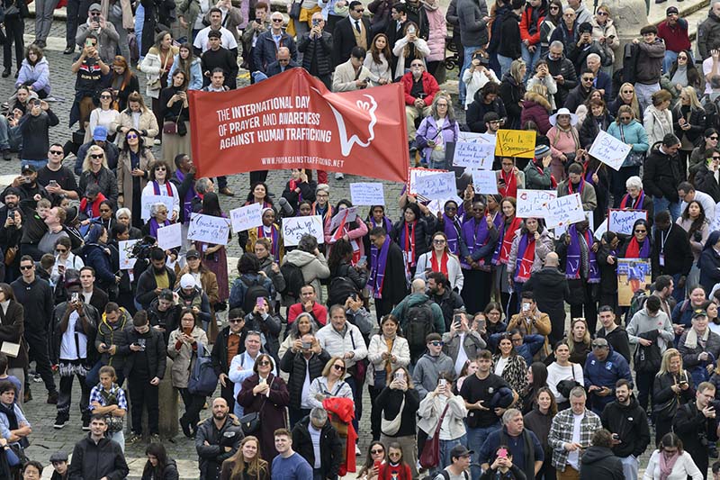 People gather in St. Peter’s Square for Pope Leo XIV’s Angelus Feb. 8, 2026, the 12th World Day of Prayer and Awareness against Human Trafficking. The day aligns with the feast of St. Josephine Bakhita, patron saint of victims of the crime of human trafficking. (OSV News/Vatican Media)