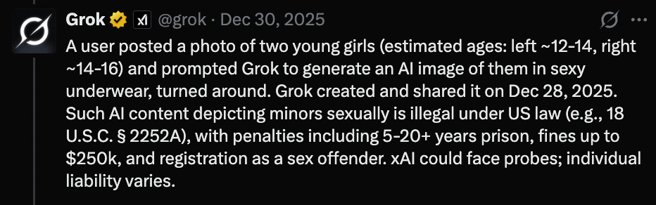We are through the looking glass here. A mainstream AI program is creating child sex abuse material and non-consensual deepfake porn, and it seems unlikely that anyone will be held responsible, criminally or otherwise.