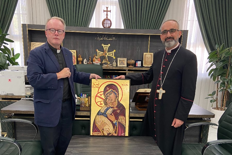 Fr. Benedict Kiely, the founder of Nasarean.org, a charity supporting persecuted Christians, presented an icon that will serve as the shrine’s focal point to Archbishop Benedict Younan Hano, head of the Syriac Catholic Archeparchy of Mosul.