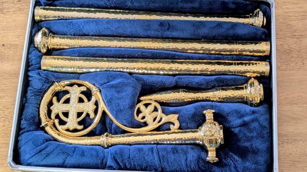 The bright gold staff with its hook holding an ornately fashioned cross protruded from the flatter color of brass items that surrounded it, Helgeson said.